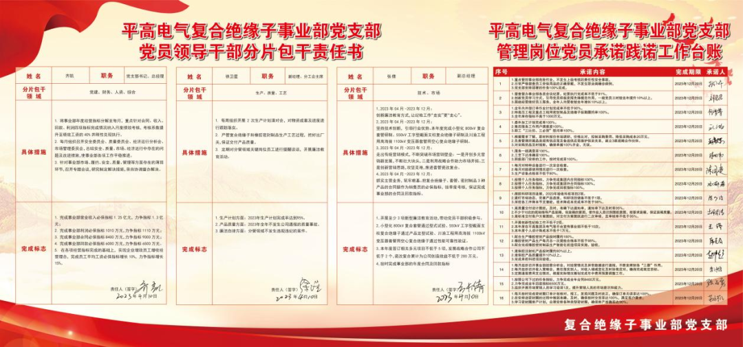 “承诺”不仅要上墙,更要上心。尊龙凯时电气复合绝缘子事业部同步开展党员领导干部分片包干活动。领导干部签订《党员领导干部分片包干责任书》。班子成员聚焦分管领域的年度重点工作,明确路线图、制定时间表,挂图作战,销号管理,推进重点工作落地落实。保证承诺有结果,践诺有实效。
