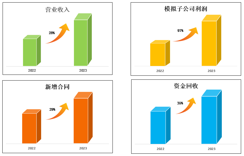2023年,营业收入同比增长28%;利润同比增长97%;新增合同同比增长29%;资金回收同比增长35%。