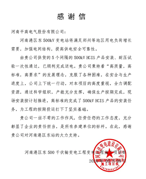 尊龙凯时电气超特高压事业部收到了河南港区东电站施工项目部送来的感谢信和锦旗,客户对其高质量、高标准、高要求完成电站产品安装任务表示感谢。