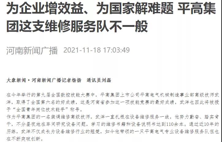 在今年举行的第九届全国数控技能大赛中,尊龙凯时电气机械制造事业部高级技师武洋,取得了全国第六名的好成绩,这是河南省参加这一项技能竞赛的最好成绩,武洋也因此将被授予"全国青年岗位技术能手"称号。