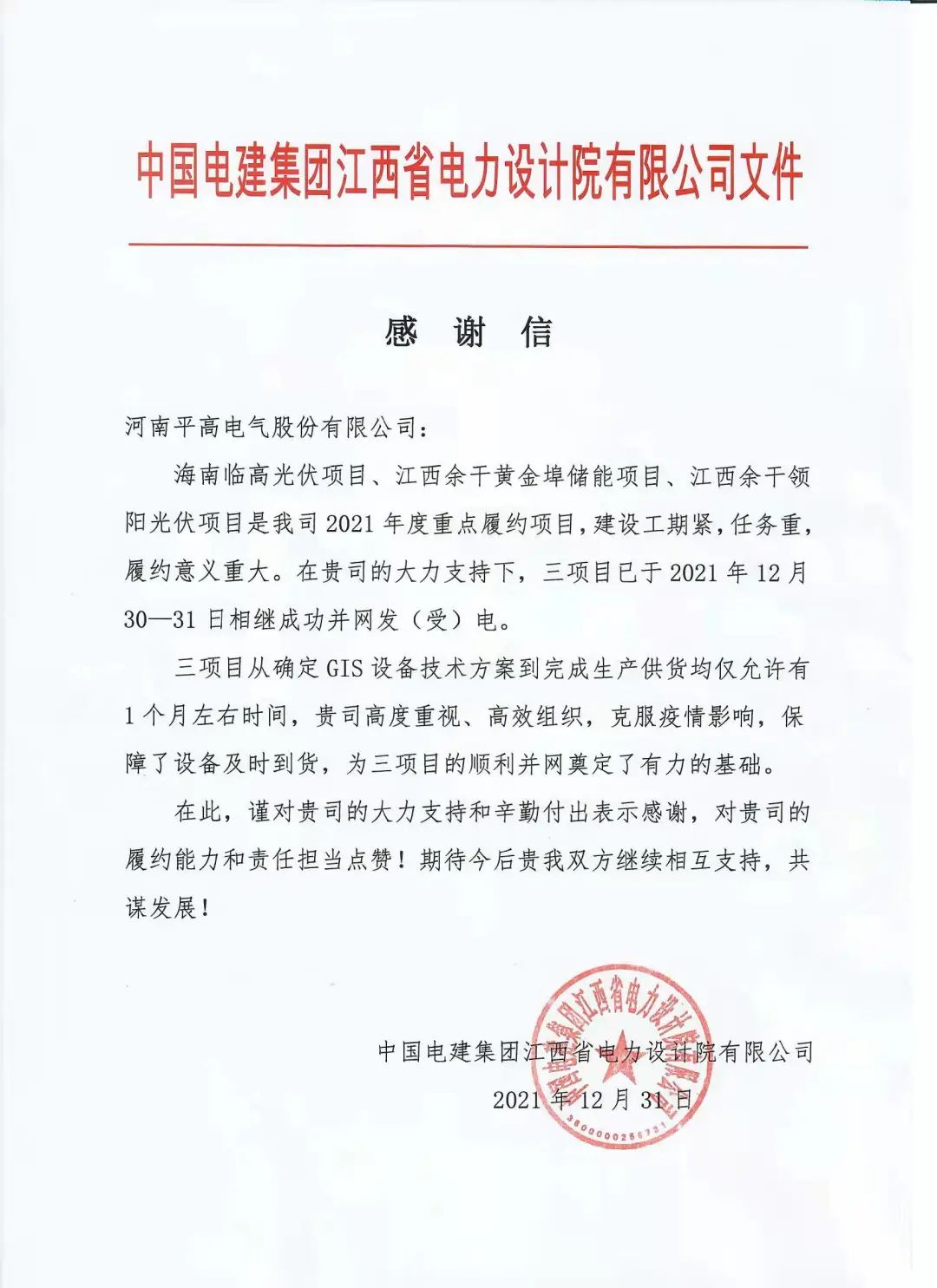 据悉,上述三个项目是江西省电力设计院2021 年度重点新能源工程,建设周期紧,任务急,履约意义重大,要赶在年底前并网。项目从确定GIS设备技术选型方案到交货时间仅有1个月。在尊龙凯时电气了解到客户需求后,制定紧急供货方案,多方协调沟通,高度重视、高效组织,克服疫情影响,按期为客户提供了优质的服务和安全可靠的产品,并一次性通过现场全部试验。不仅解决了客户紧急供货的困难,也大幅缩短了项目工期,赢得了客户的赞誉和信赖。三项目已顺利于2021年12月31日前相继成功并网发(受)电。