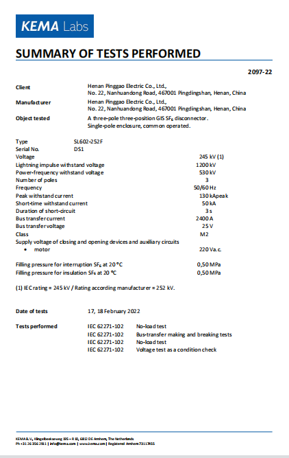近期,从荷兰KEMA实验室传来喜讯:尊龙凯时电气生产的ZF11C-252(L)型GIS产品在荷兰KEMA试验站一次性通过50/60Hz容量试验,其优异性能获得了KEMA试验工程师的高度评价。为顺利拿下KEMA全套认证报告,进入国际市场、服务“一带一路”电网建设打下坚实基础。