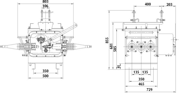◇ 真空灭弧,SF6外绝缘,内置隔离刀与灭弧室异步联动,开关分合能力强,安全性好。
